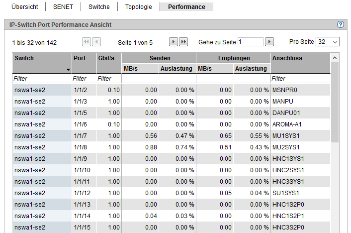Einen Überblick über Performance und Auslastung der Switche in der Net Unit liefert die Registerkarte Performance. Für jeden Net Unit-Port (für jede aktive Verbindung der Net Unit) werden der maximale sowie der momentane Datendurchsatz (in MB/s) und die Auslastung (in %) angezeigt. Bei Datendurchsatz und Auslastung wird zwischen Sende- und Empfangsrichtung unterschieden.