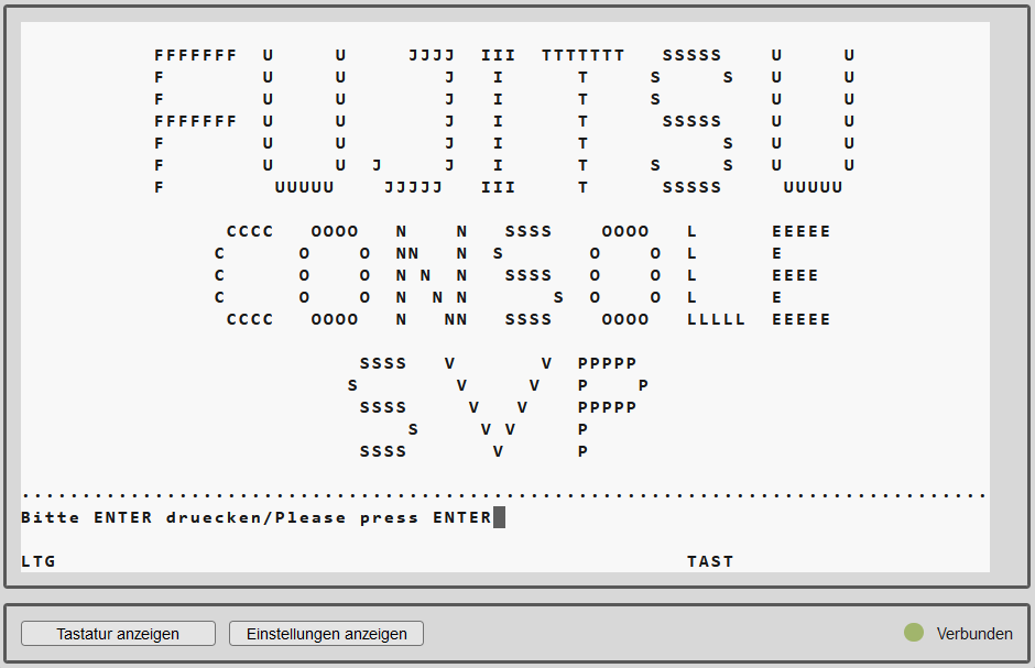 Sobald die Meldung NSI0000 „System ready“ anzeigt, ist das Hochfahren von BS2000 im Wesentlichen abgeschlossen. An der Konsole können Sie die laufende BS2000-Session weiter beobachten und bei Bedarf auf Systemmeldungen reagieren (z.B. eine Mount-Meldung beantworten).