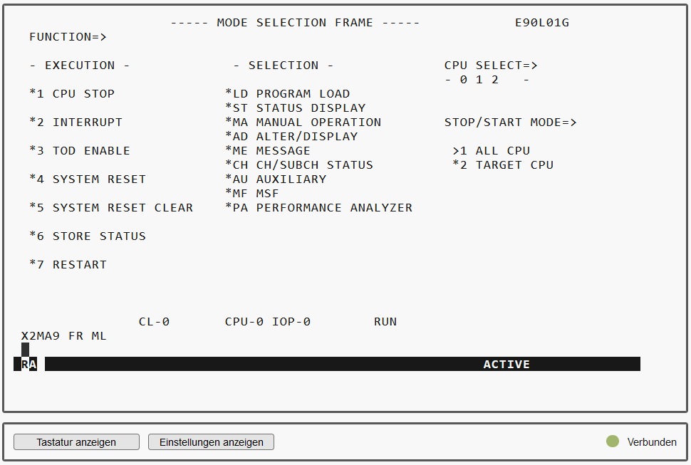 > | Drücken Sie die Eingabetaste. Es erscheint der MODE SELECTION FRAME. Wenn bereits mit dem SVP gearbeitet worden ist, dann erscheint der zuletzt verwendete Frame. Sie erreichen den MODE SELECTION FRAME durch Eingabe von FR ML in der Eingabezeile.Sie können die SVP-Konsole wie gewohnt über die Tastatur bedienen. Für Eingaben an der SVP-Konsole steht Ihnen auch eine virtuelle Tastatur zur Verfügung. Klicken Sie unten links Tastatur anzeigen, um die virtuelle Tastatur zu öffnen. Durch Klicken von Tastatur verbergen schließen Sie die Tastatur-Anzeige wieder. Tragen Sie die im Frame angezeigten alphanumerischen Zeichen in die durch einen Pfeil ( |