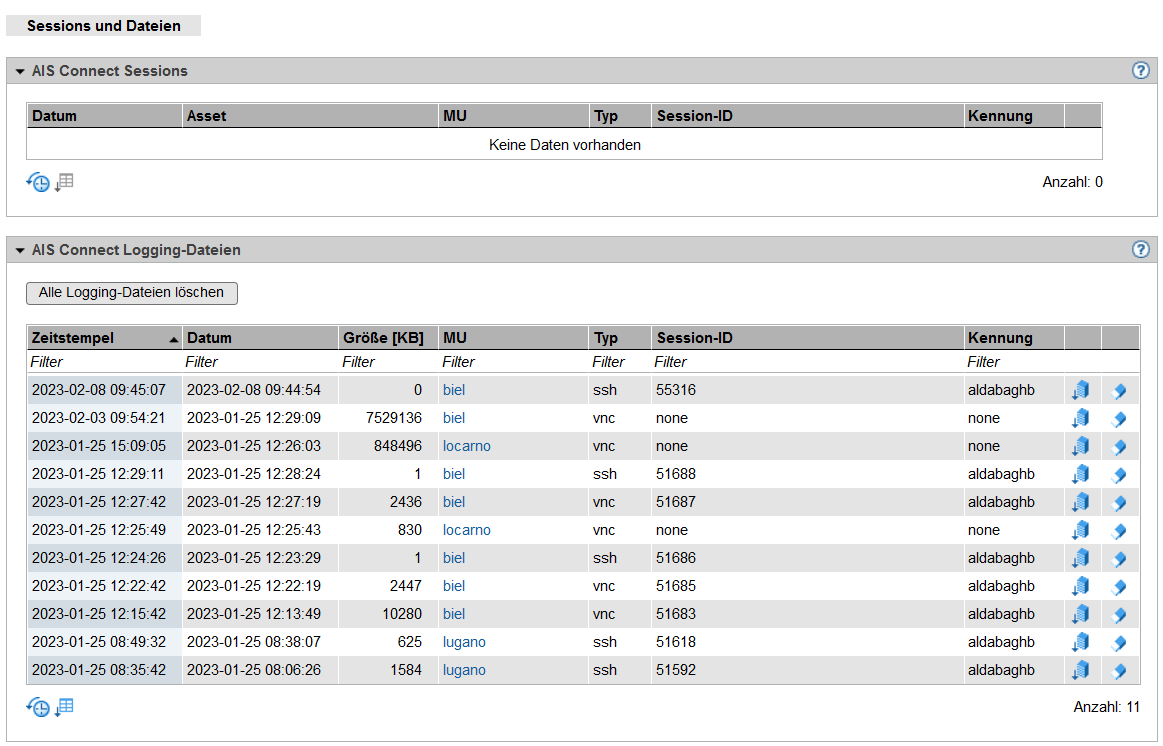 Öffnen Sie im Menü Service -> Remote Service Sessions des SE Managers die Registerkarte Sessions und Dateien und löschen Sie dort die gewünschten Logging-Dateien oder alle Logging-Dateien: