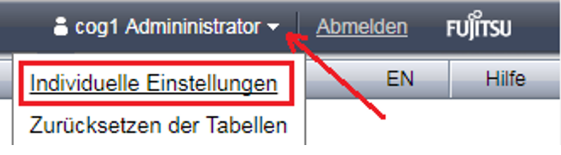 > | Im Kopfbereich des SE Manager-Hauptfensters auf den Pfeil neben dem Anmeldenamen klicken und anschließend in der Dropdown-Liste Individuelle Einstellungen klicken, um den Dialog zur Änderung des Session-Timeout zu erhalten: |