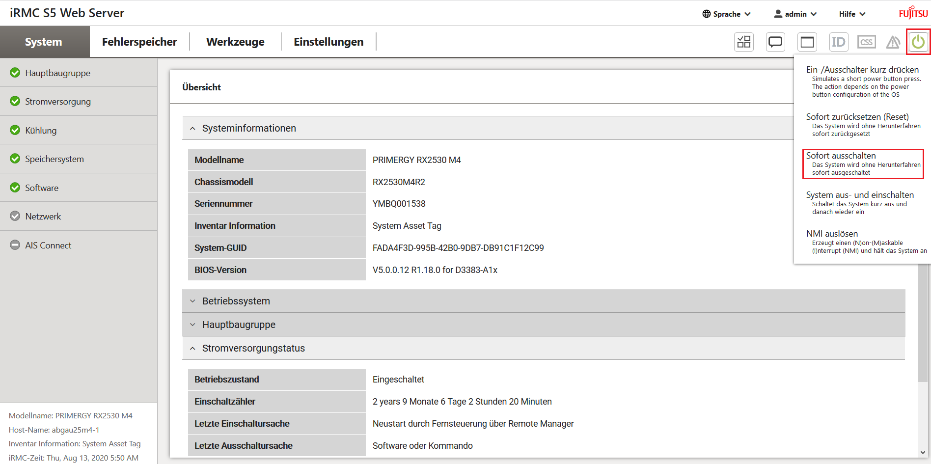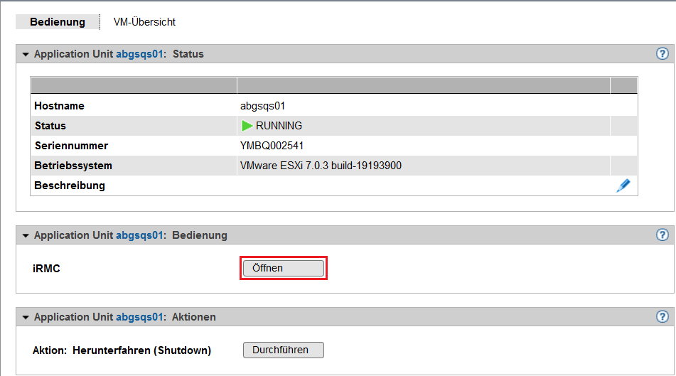 > | In der Registerkarte Bedienung in der Gruppe Bedienung bei iRMC auf Öffnen klicken: Bei einer partitionierbaren AU (einer AU PQ, z.B. AU87) laufen Systeme jeweils auf den einzelnen |