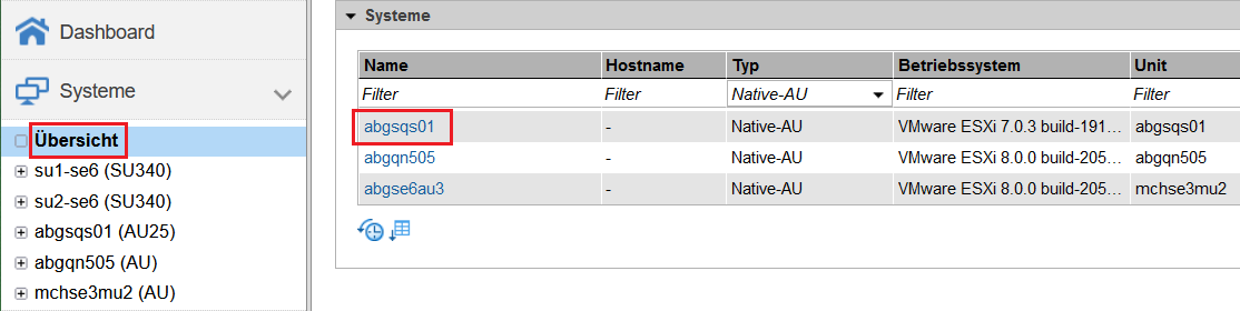 > | In der Übersicht der Systeme den Namen der gewünschten AU anklicken um deren Bedienung aufzurufen: |