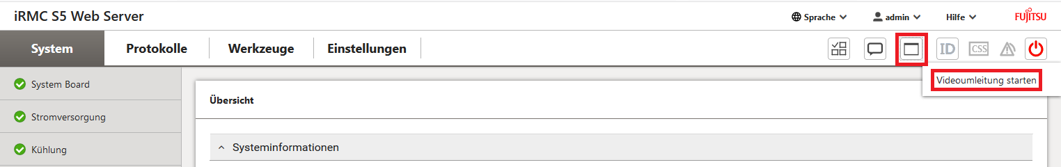 > | Klicken Sie im iRMC-Fenster oben rechts auf das Icon System-Ein-/Ausschalter und dann auf Einschalten. |