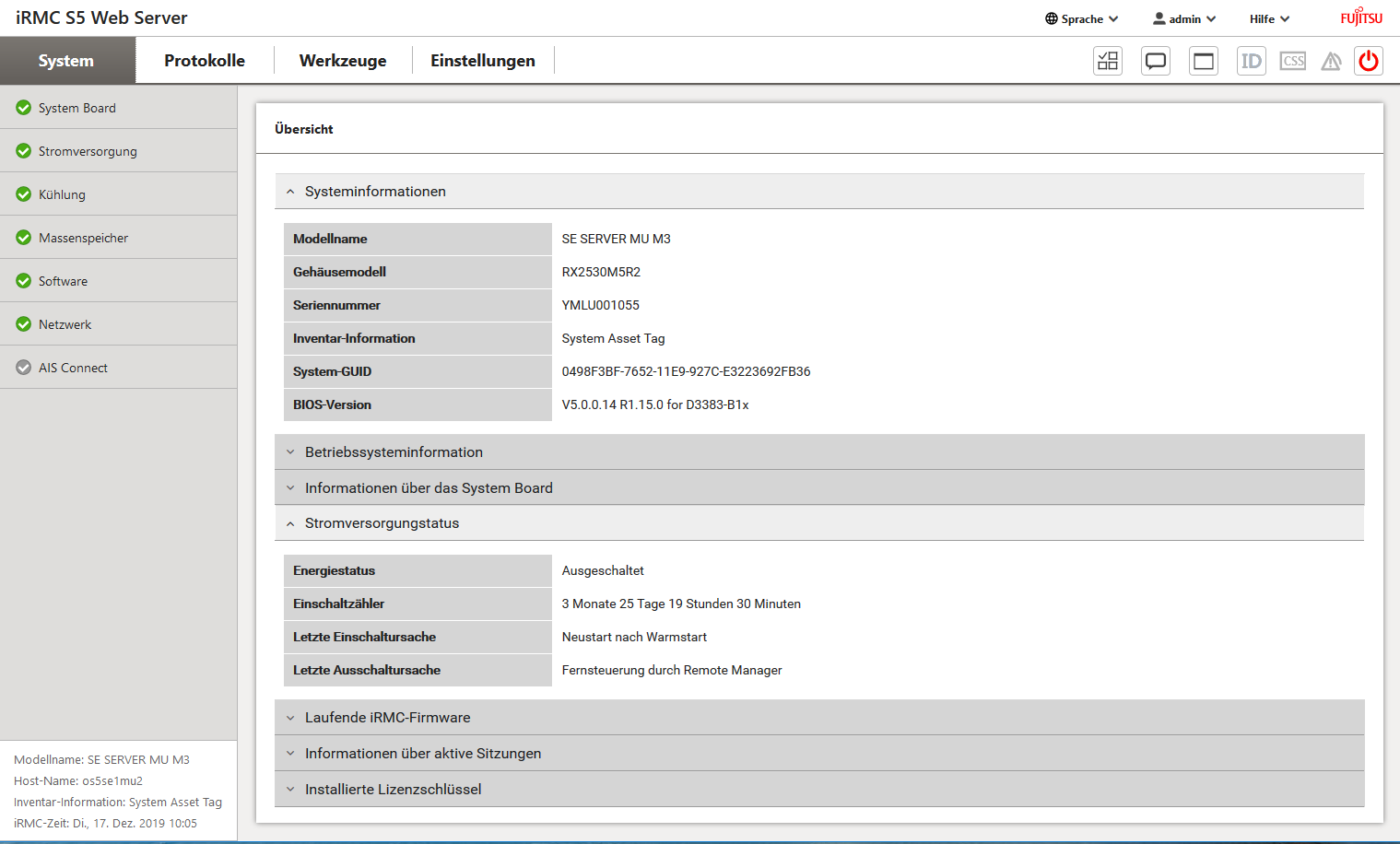 Der iRMC (integrated Remote Management Controller) der Management Unit ist zugreifbar.