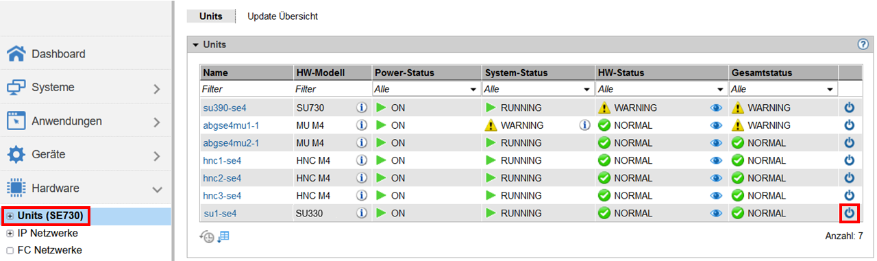 Anmeldung als Administrator, BS2000-Administrator (nur MU, HNC), BS2000-Operator (nur MU, HNC) oder AU-Administrator (nur AU) Die Unit ist eingeschaltet (Power-Status zeigt den Wert ON). Die möglichen Aktionen sind Situations- und Unit-abhängig. Falls keine Aktion möglich ist, zeigt der Tooltipp den Grund an. |