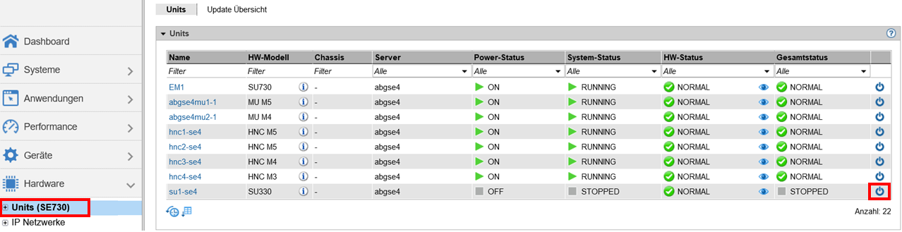 > | In der Units-Tabelle bei der gewünschten Server Unit das Einschalten-Icon klicken (im Beispiel eine SU330) und im nachfolgenden Dialog die Aktion mit Durchführen bestätigen: |