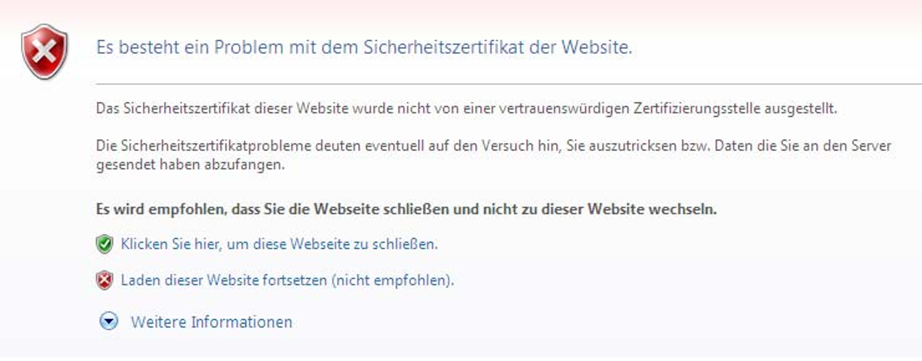 Wenn die aufgerufene Web-Oberfläche ein selbstsigniertes Zertifikat verwendet (also z.B. das vorinstallierte Standard-Zertifikat), lehnen Web-Browser den Aufruf der Seite ab, da das Zertifikat aus ihrer Sicht nicht vertrauenswürdig ist.