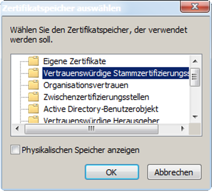 > | Wählen Sie Vertrauenswürdige Stammzertifizierungsstellen als Zertifikatspeicher und klicken Sie OK und dann Weiter: |