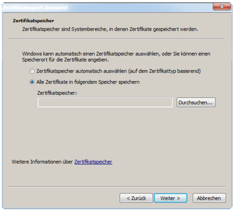 > | Wählen Sie die Option Alle Zertifikate in folgendem Speicher speichern und klicken Sie Durchsuchen...: |