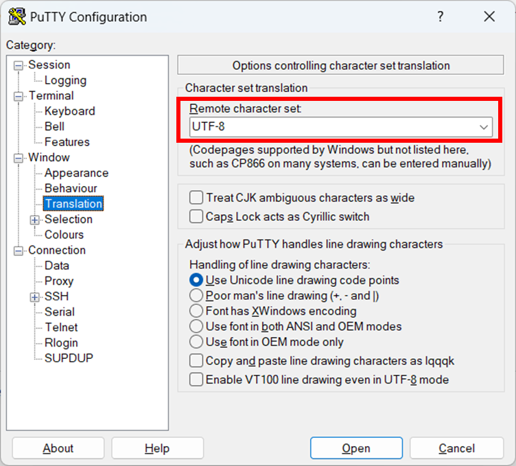 Make sure to use the default character set UTF-8 that supports the display and the keyboard shortcuts required in the BS2000 dialog (Window -> Translation menu):