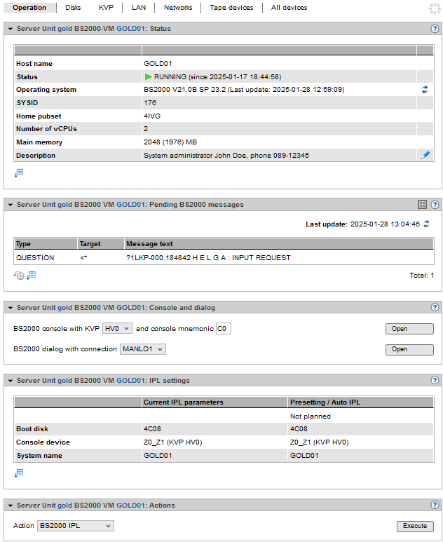 The Operation tab displays the status of the VM, enables you to enter or change a description of the VM, displays pending BS2000 messages, offers access to the BS2000 console and BS2000 dialog, and allows the following actions, depending on the situation: