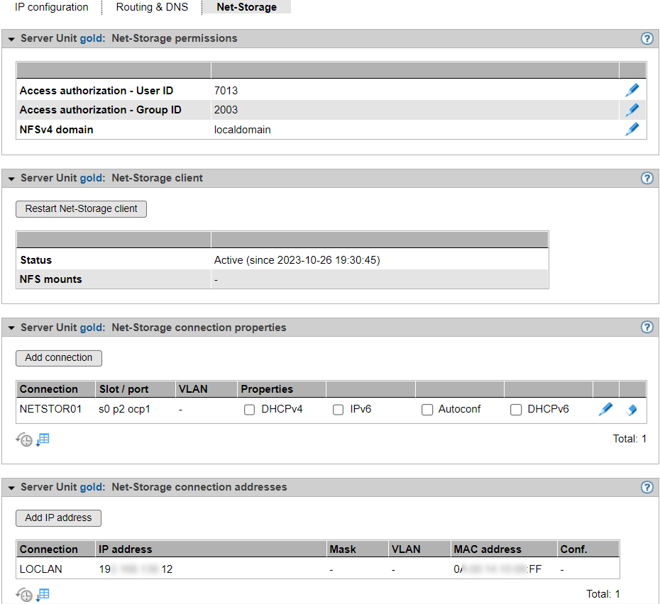 The Net-Storage tab displays the Net-Storage permissions, Net-Storage client, Net-Storage connection properties, and Net-Storage connection addresses groups. The following functions are available: