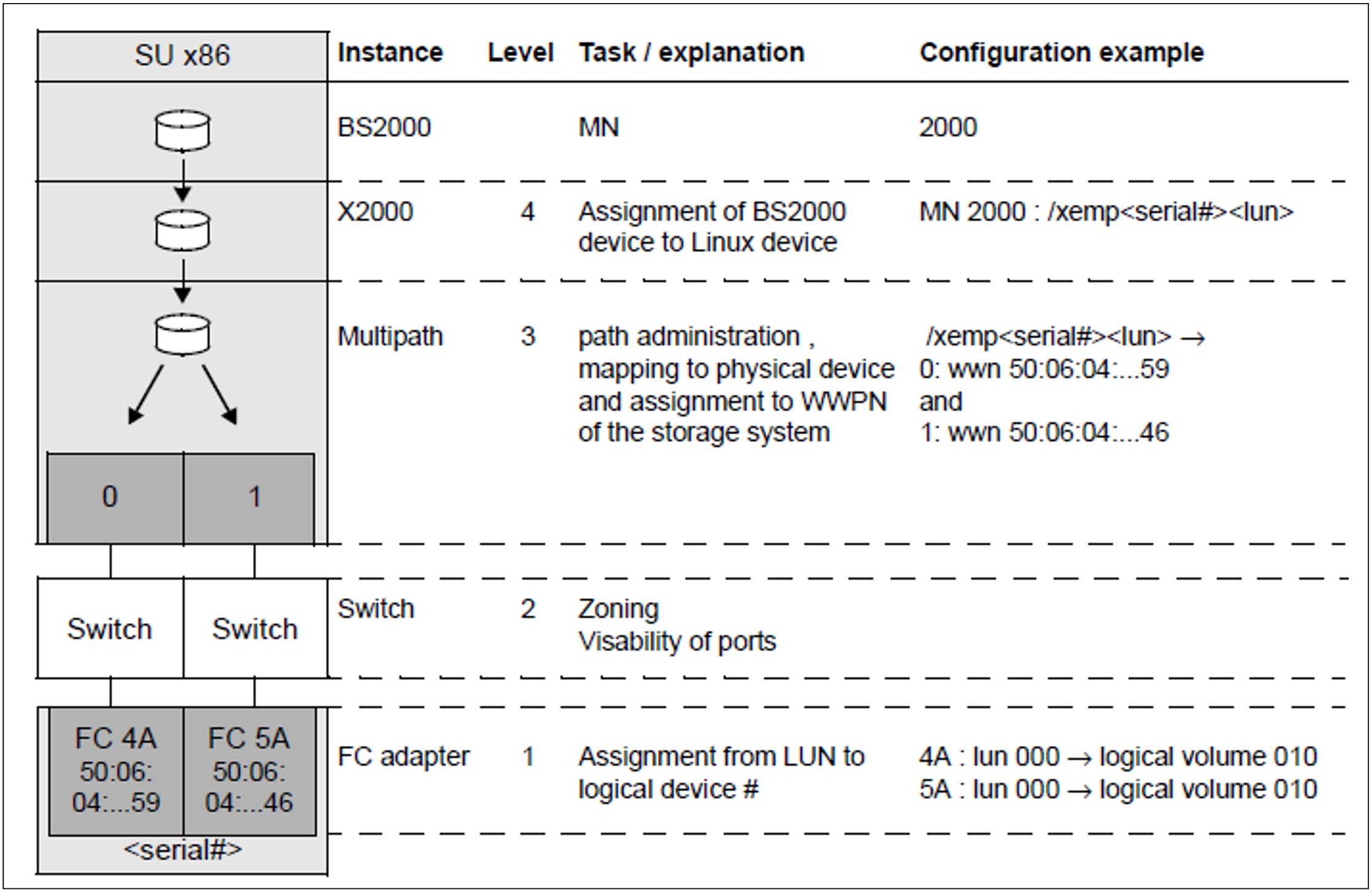 FibreChannel-connected BS2000 disks on an SU x86 must be configured at Storage(1), Switch(2) and X2000(4) levels. No special configuration is necessary at Multipath(3) level. However, it is necessary for Multipath to know the connected devices. For this purpose Customer Support can scan the devices, if required. When an operational interruption is acceptable, you can as an alternative reboot the Server Unit.