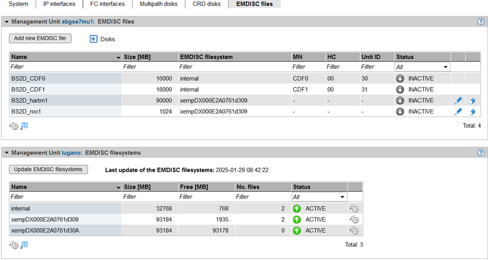 The displayed data can be updated by clicking on Update EMDISC filesystems. The Repair EMDISC filesystem action is available for individual EMDISC filesystems for authorized users and only if the EMDISC filesystem is not already in the ACTIVE state.
