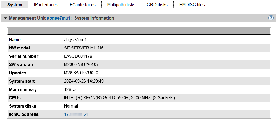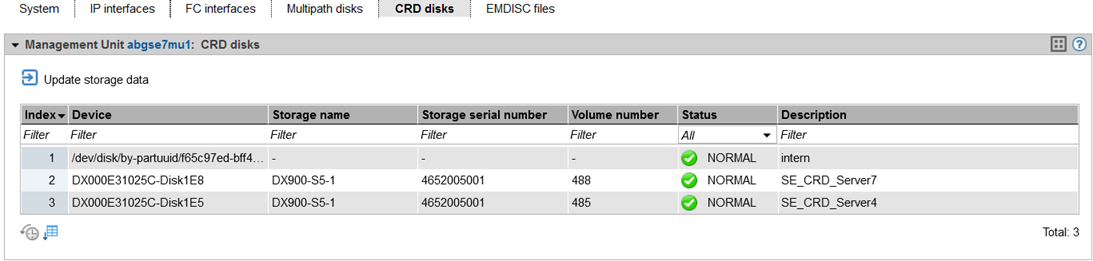 The CRD disks tab in the Information menu displays the status of the internal and, if existing, the external CRD disks (configuration disks) of the Management Unit.