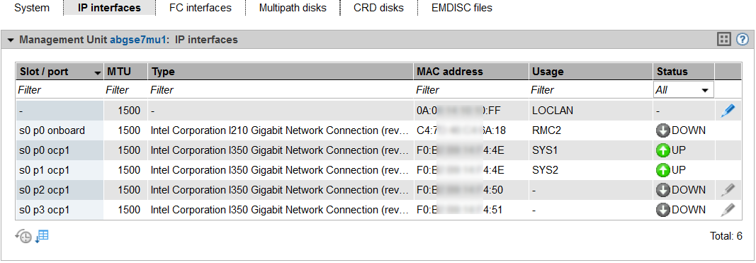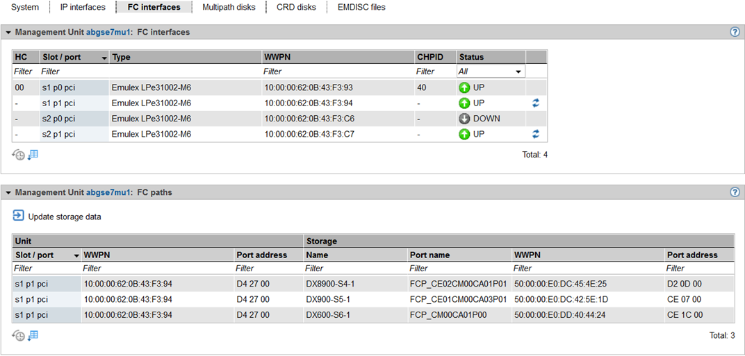 FC interfaces provides information for each FC interface of the MU on the host controller used, the plug-in position (slot and port), the Type (firmware and revision status), the local WWPN (World Wide Port Number) of the FC interface, and the connection channel to the Server Unit /390 (Channel Path ID - CHPID). The hardware status of the FC interface is also displayed (UP / DOWN). For MUs without SKP functionality the columns HC and CHPID are not displayed.