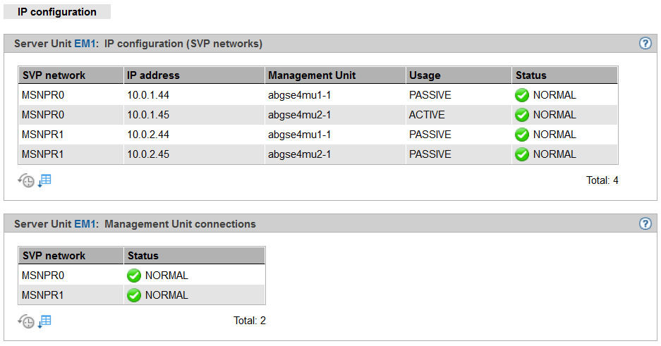 The IP configuration of the SU /390 is displayed using the associated Management menu. The IP configuration tab displays information on SVP networks and connections: