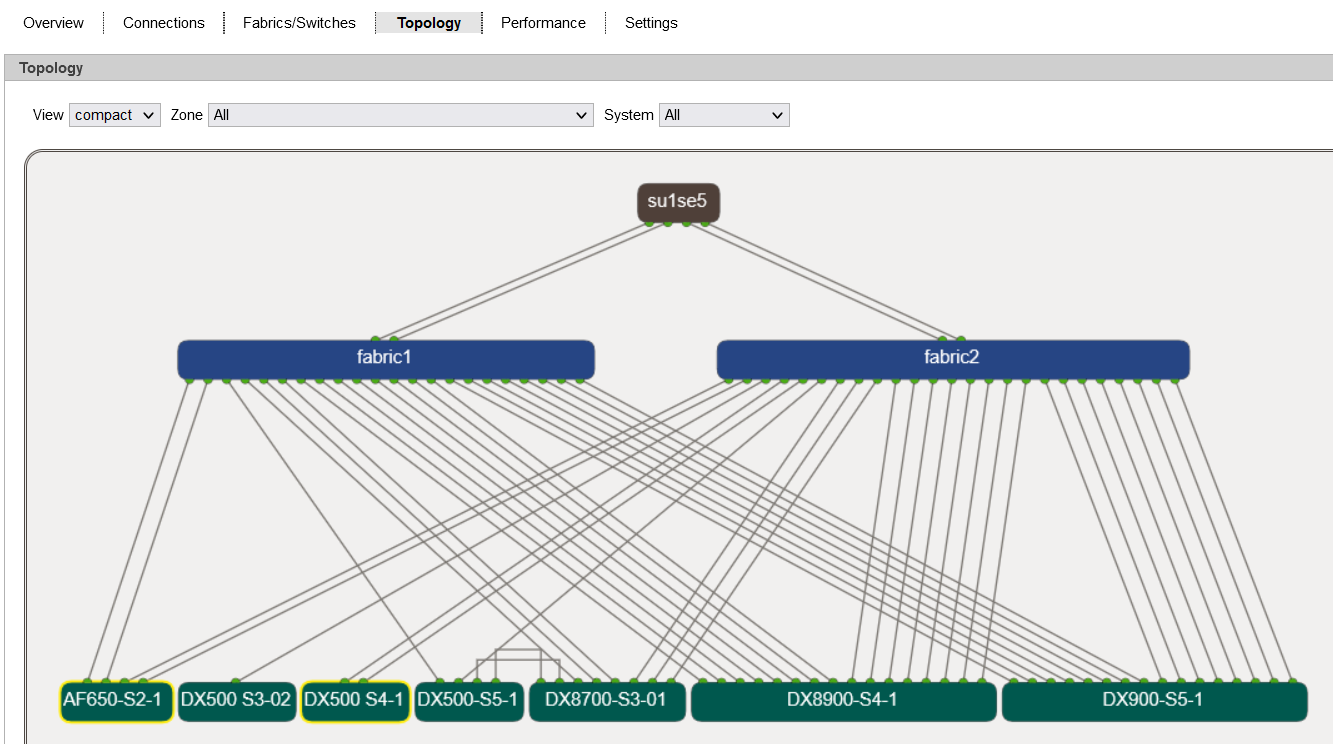 The view can be switched between detailed and compact. In the compact mode, only the main components like fabrics, servers and storage systems are visible.