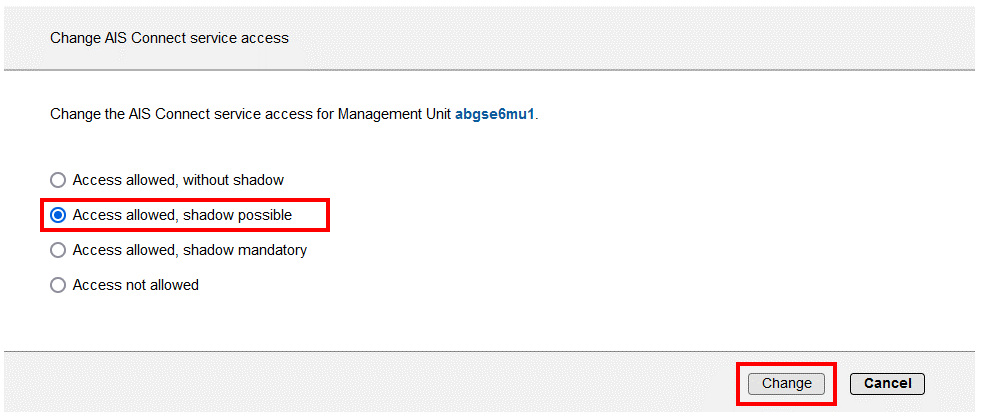 > | Select the required setting for the service access (here: Access allowed, shadow possible) and click Change: |
