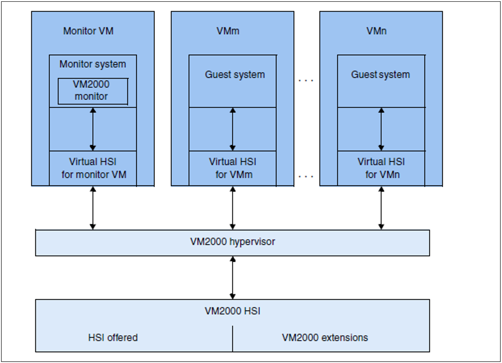 The VM2000 monitor manages all VMs and provides its functions via the VM2000 interface.