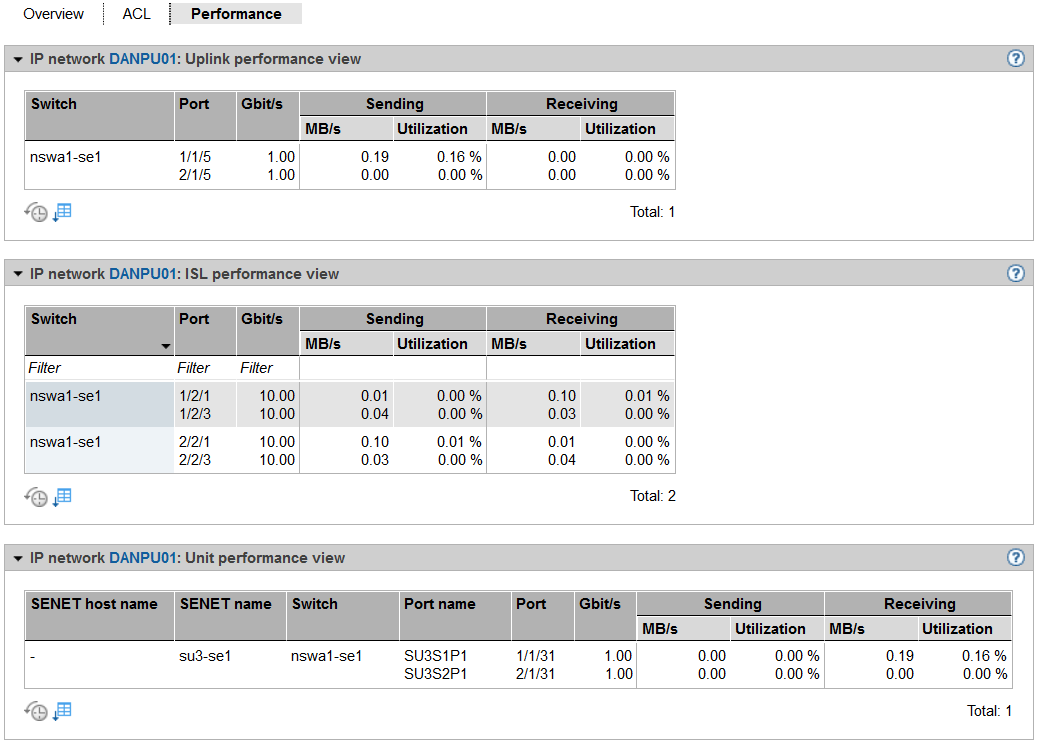 An overview of the performance and utilization of the ports belonging to the network is provided by the Performance tab.