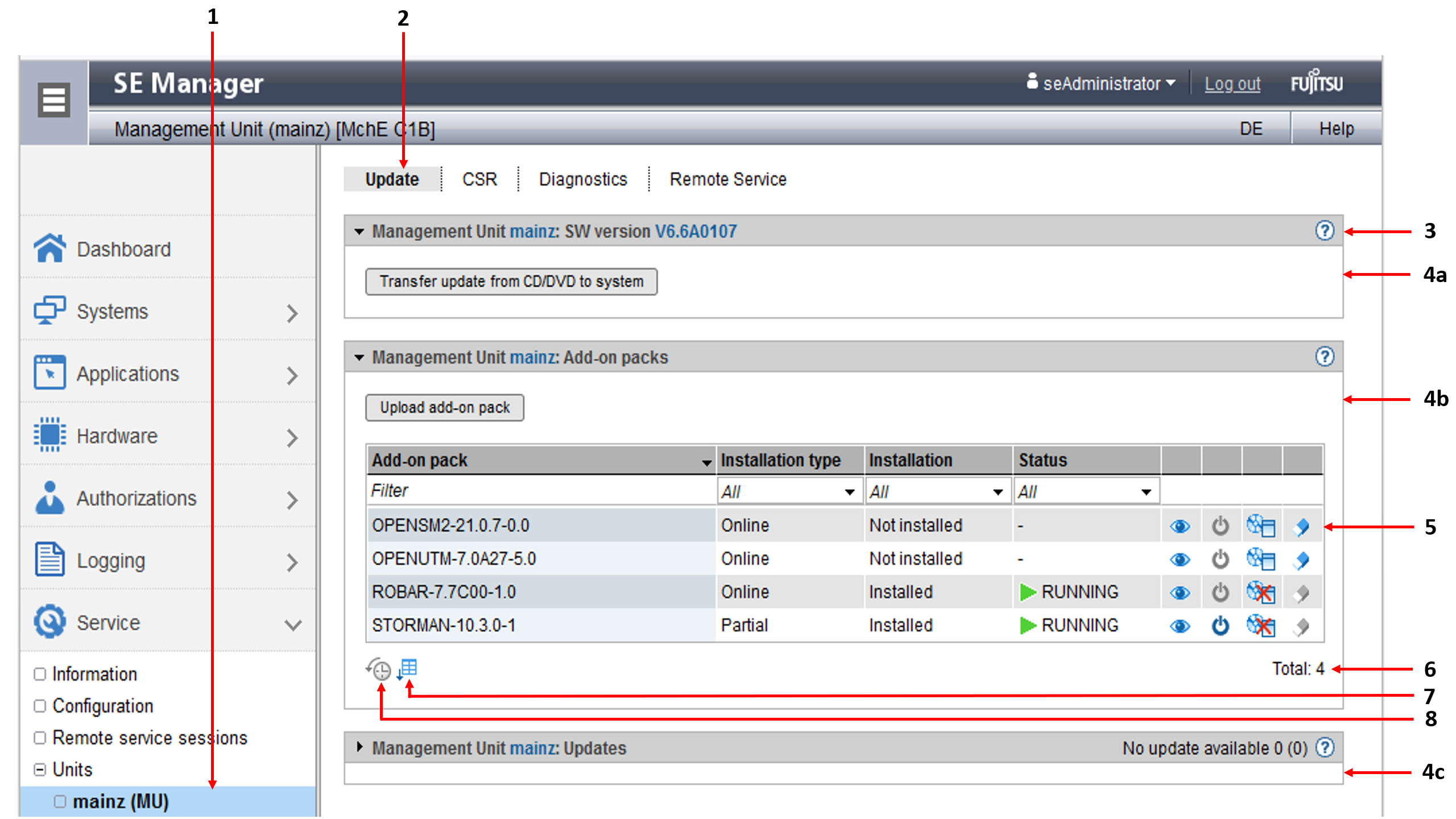 The main window of the SE Manager opens as soon as you have logged in on the SE Manager. The next two figures provide an example to name the areas in the main window and the principle controls.