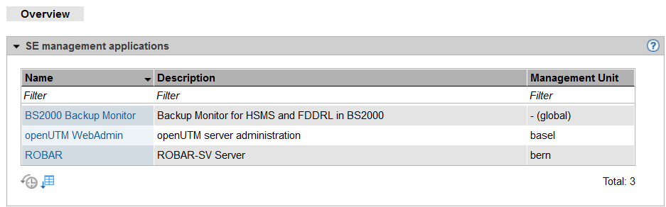 > | In the tree structure select Applications -> SE management. The Overview tab opens. |