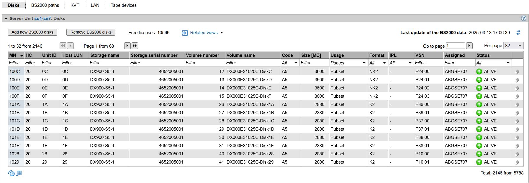The columns Host LUN, Storage name, Storage serial number, Volume number, Volume name and Status are supplied only, if STORMAN is properly configured and the storage data is updated. For this, the Update storage data dialog in the Hardware -> Storage menu must be called.