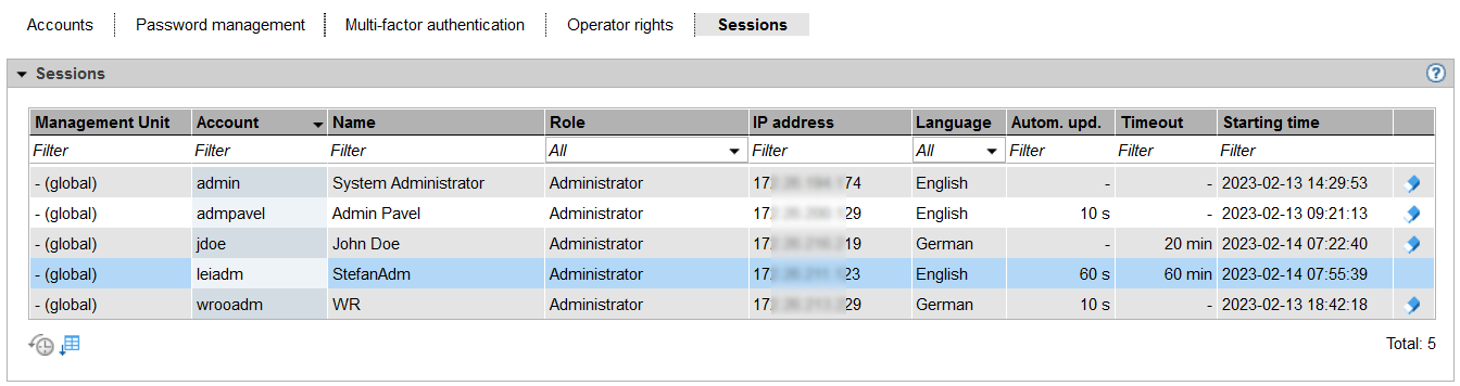 The Sessions tab informs the administrator resp. security administrator about all sessions of users who are currently logged in on the SE Manager of a Management Unit of the SE server or Management Cluster.