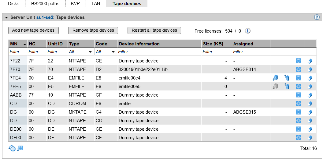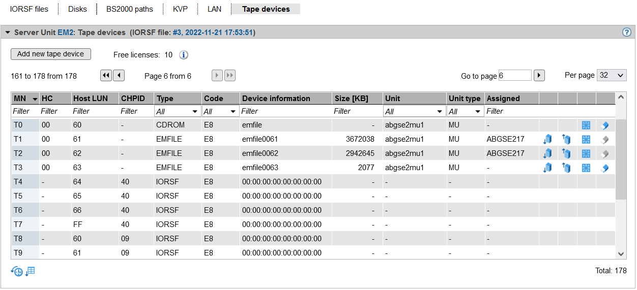 Entries of the type EMFILE, CDROM, and DATA display the emulated tape devices already defined. If the device is also generated in the IORSF, a valid channel path identifier is displayed under CHPID. Otherwise only a warning icon is displayed under CHPID, and the device must still be generated (in BS2000 with /ADD-IO-UNIT).