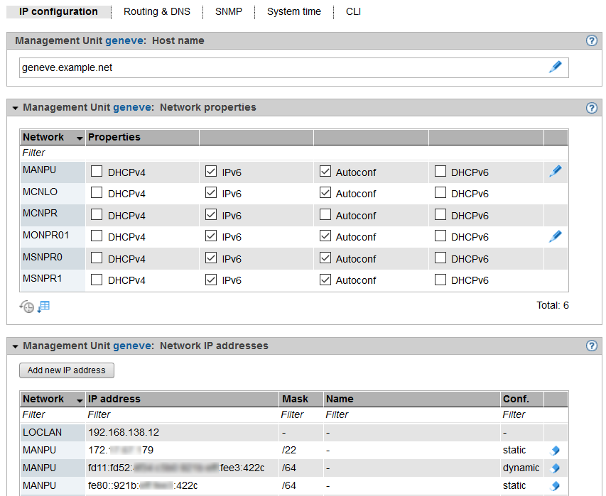 You manage the IP configuration of the Management Unit using the associated Management menu, IP configuration tab.