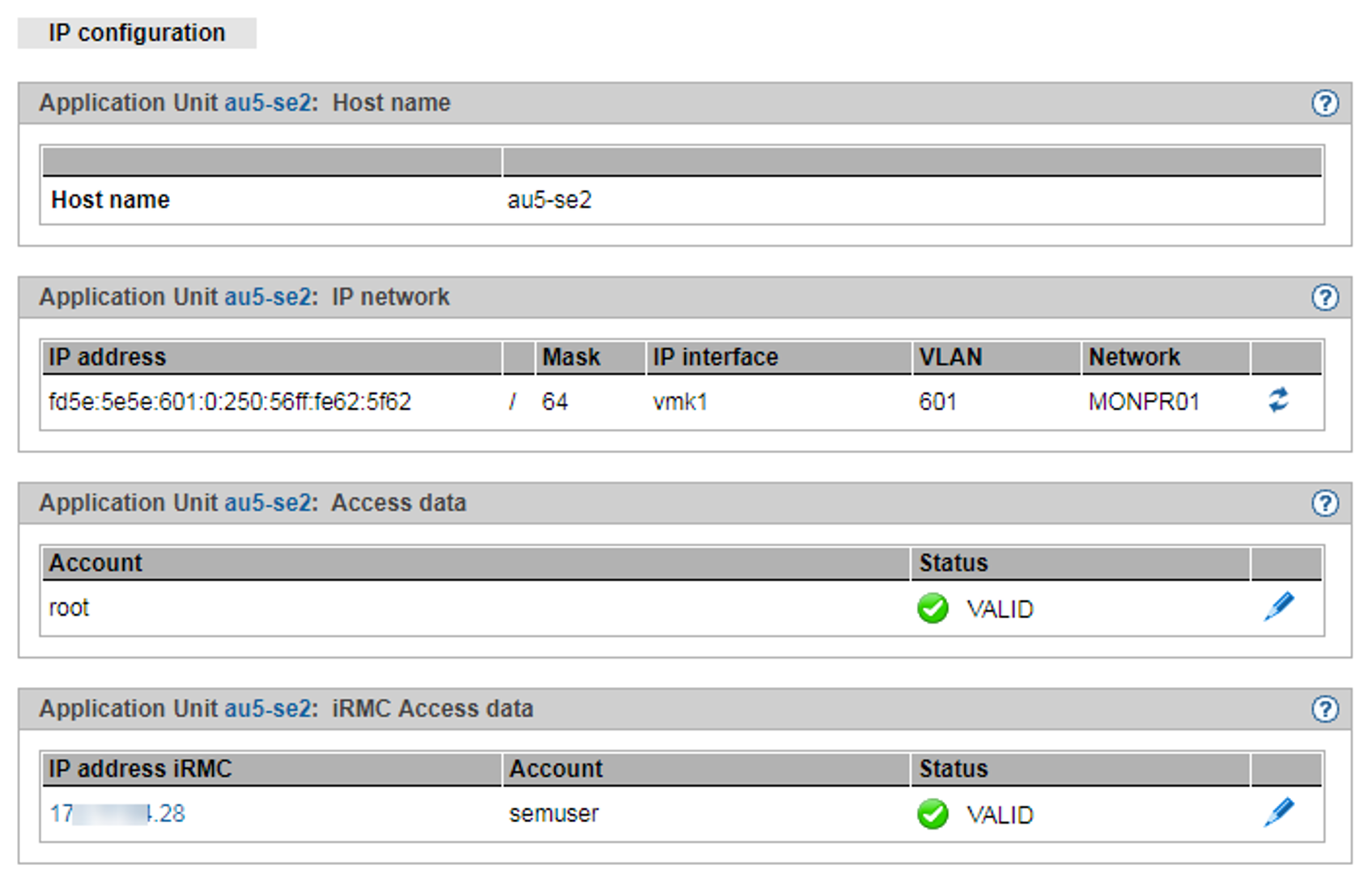 The IP configuration tab displays the groups Host name, IP network, Access data (only for AU with the VMware vSphere ESXi or Microsoft HyperV operating system), and iRMC Access data.