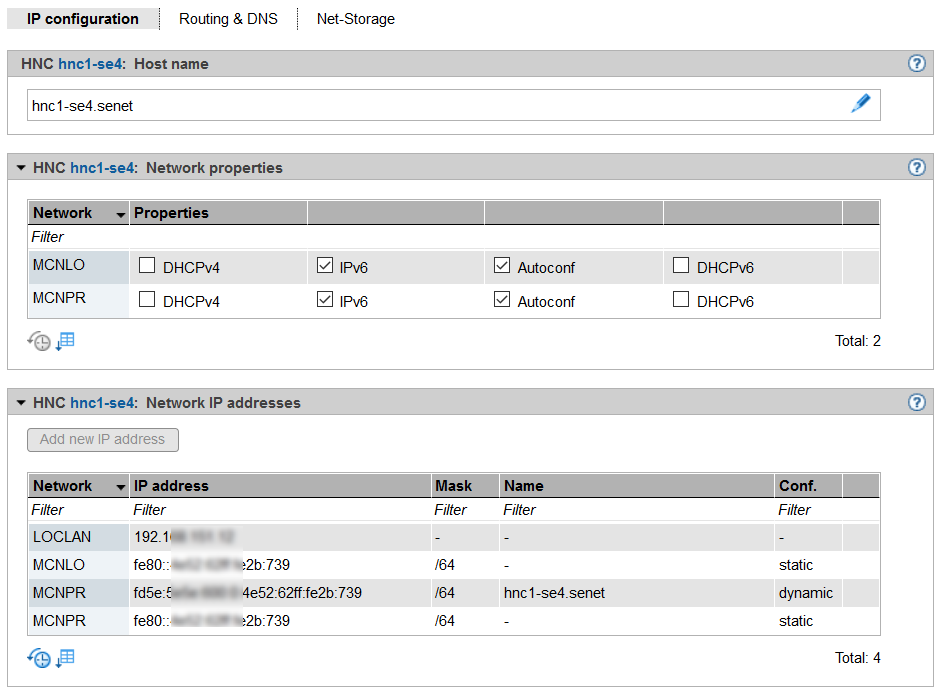 The IP configuration tab displays the host name, network properties, and network IP addresses of the HNC in three groups.