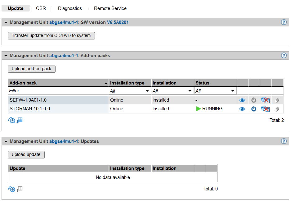 All updates contained on the CD/DVD are transferred to the system. They are then displayed in the relevant group and can be used further.Add-on packs group (for Management Units only)