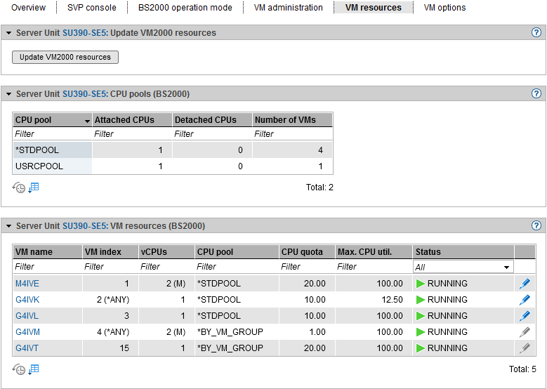The VM resources tab provides information on the use of the CPU pools and displays the list of BS2000 VMs with the VM resources. The following functions are available: