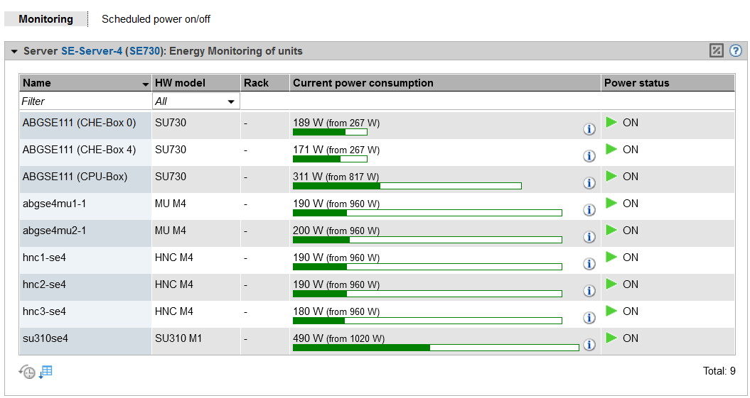 The Monitoring tab displays the current energy consumption, the hardware-specific maximum performance, and the power status for all units of the SE server (SU, MU, HNC, and AU).