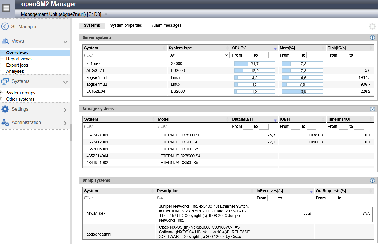 The openSM2 Performance Monitor can be integrated into the SE Manager as add-on pack OPENSM2. This enables the performance of the Server Units and the systems running on them to be monitored centrally using the SE Manager. openSM2 is optional and chargeable.
