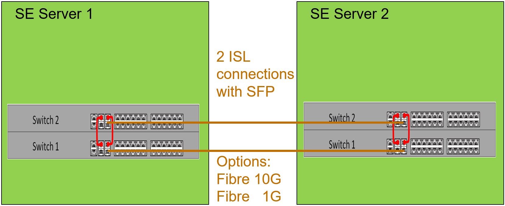 The Net Units (their internal LAN switches) of the connected SE Servers are linked with one another with ISL (ISL: Inter Switch Link) connections for this.
