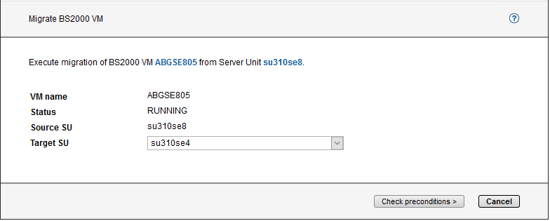 It is checked if the resources and prerequisites needed for the BS2000 system to be migrated are fulfilled on the target SU (devices, size of the needed main memory, free VM index, etc. See chapter -> Usage scenarios and preconditions for LM). The discovered issues or conflicts are reported directly to the caller in the wizard.