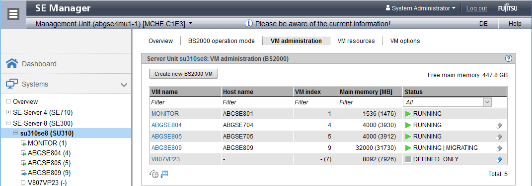 In the status field, “MIGRATING” is shown as sub-status to the current status as well as the target SU. - Main window with system overviews for example “VM administration”