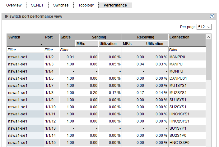 An overview of the performance and utilization of the switches in the Net Unit is supplied by the Performance tab. The maximum and current data throughput rate (in MB/s) and the utilization (in %) are displayed for each Net Unit port (for each of the Net Unit's active connections). A distinction is made between the send and receive directions for data throughput and utilization.