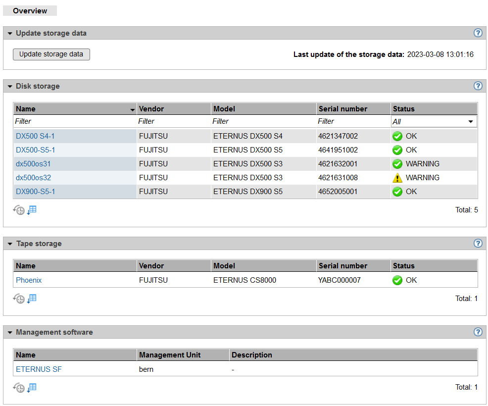 In an SE server configuration with multiple MUs, the Overview tab informs of the storage systems as well as the management software that the Storage Manager manages on all MUs. Storage systems which are found on more than one MU are displayed only once, namely with the worst status. A tool tip displays the status of the storage systems on the various MUs if you move the mouse over the icon in column Status.