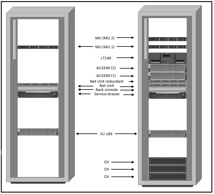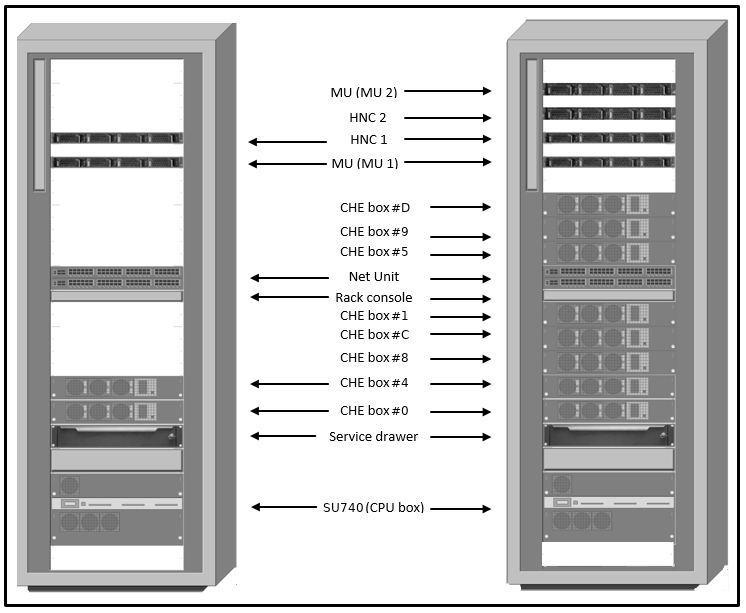 The following figure shows examplarily how the basic rack of the SE servers SE710, SE730 / SE730B resp. SE740 is equipped with the components of the basic configuration and with optional components.