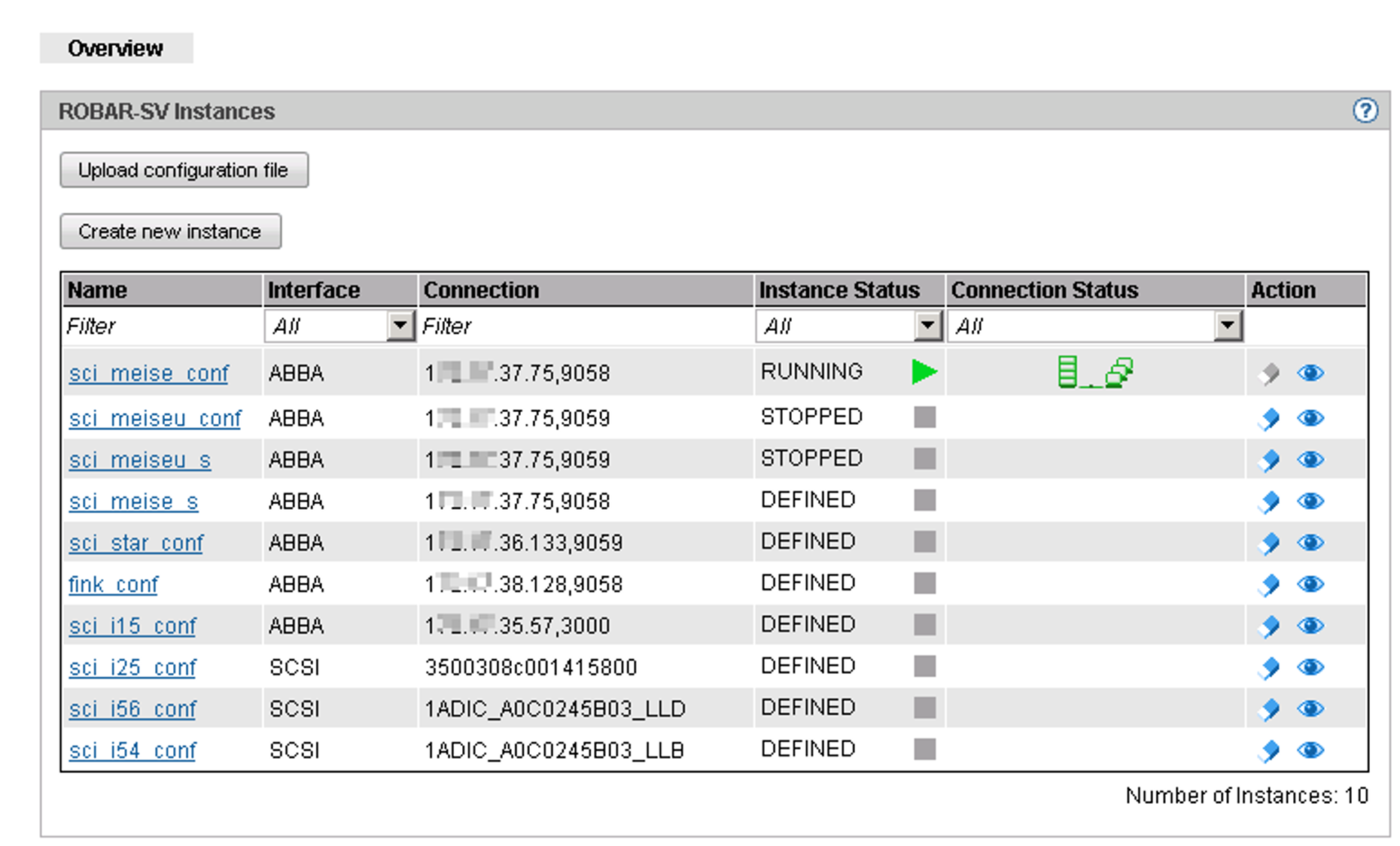 In this tab you can upload a configuration file, select and edit the configuration file of an instance, generate a new ROBAR-SV instance or delete ROBAR-SV instances. The menus of the ROBAR-SV instances and of the ROBAR-SV management are displayed in the tree structure. |