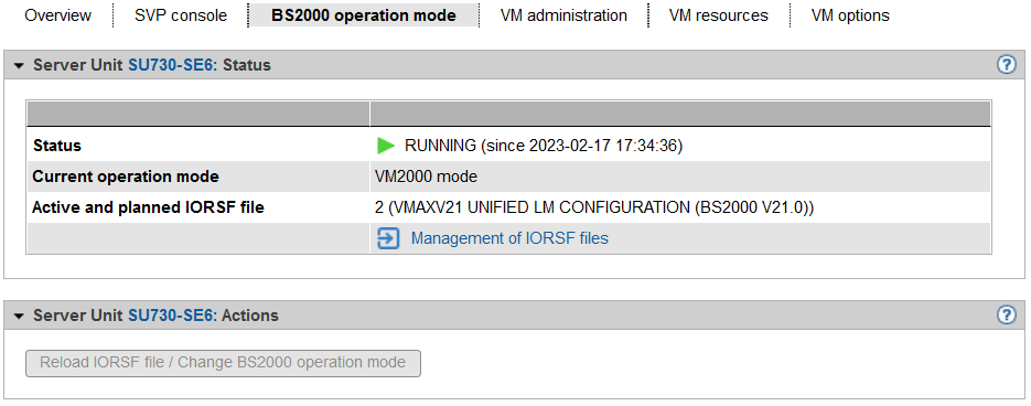 The BS2000 operation mode tab in the Status group displays the operation mode set (Native BS2000 mode or VM2000 mode) and permits this setting to be changed in the Actions group: