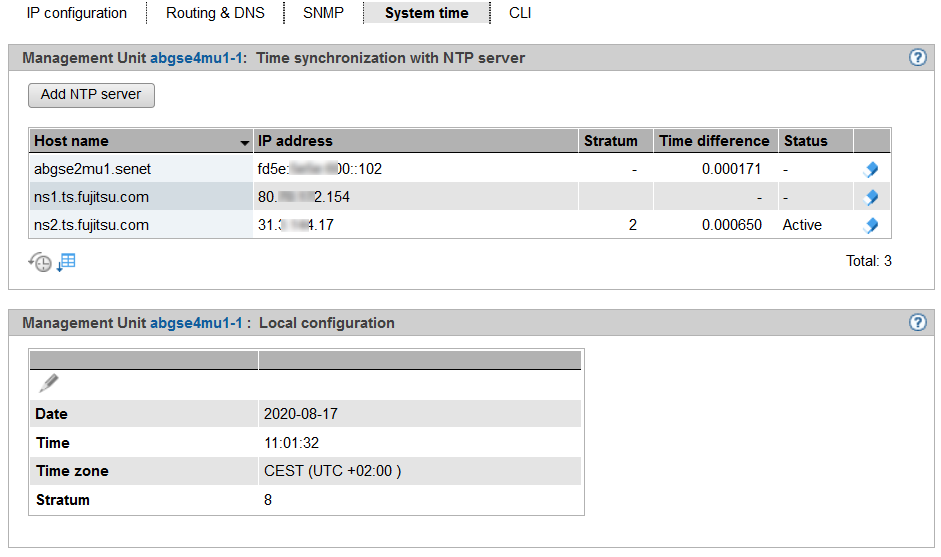 The System time tab displays the NTP servers which are configured for automatic time synchronization and the local time of the MU.