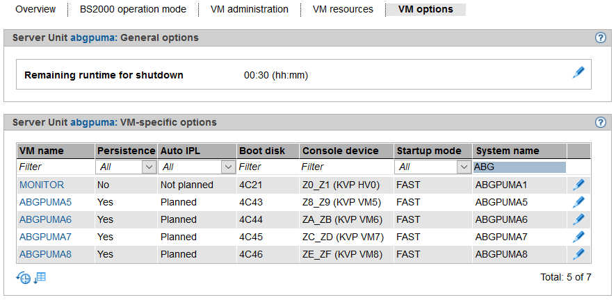You manage the VM resources of the various BS2000 VMs using the VM options tab. You can change VM-specific options, and you can also change the settings for the automatic IPL for the monitor VM (only SU x86) and persistent BS2000 VMs. For a non-persistent BS2000 VM (except the monitor VM), you can set the persistence attribute. On an SU x86 you can also set the remaining runtime for the shutdown.