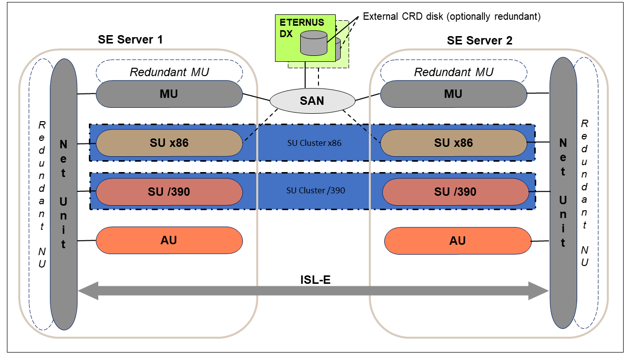 Two Server Units of the same type (SU /390 or SU x86) can be combined into a logical unit, a so-called "SU Cluster".
