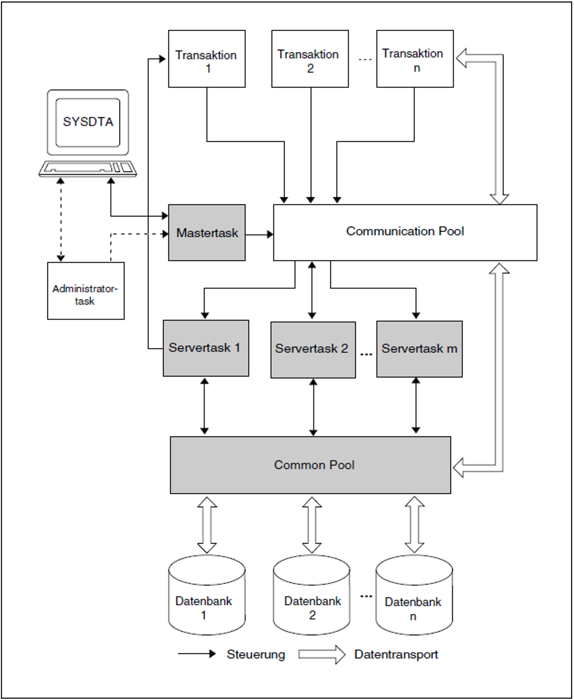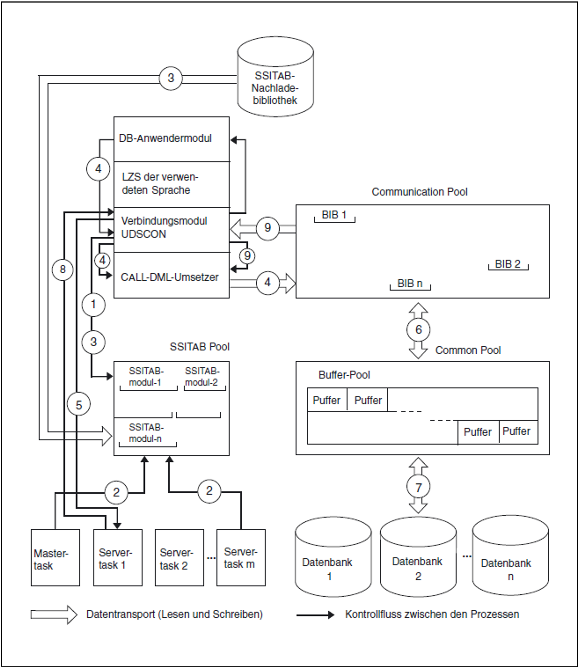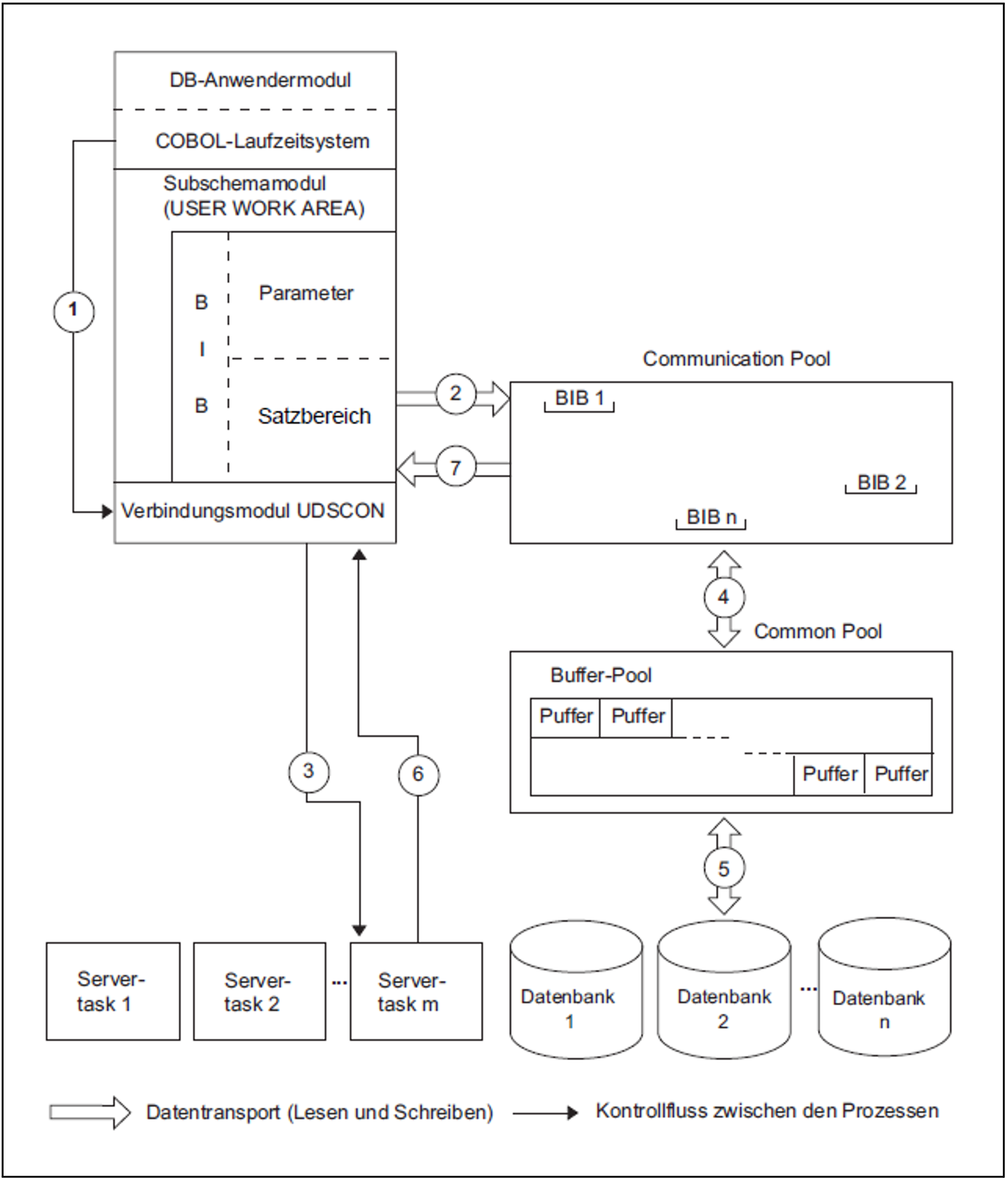 Die Servertask (Modul UDSSUB) nimmt im Communication Pool den Auftrag entgegen und führt ihn aus. Dabei greift sie über den Common Pool auf die Datenbank zu und transportiert Daten, die das Anwenderprogramm in die Datenbank schreiben oder aus ihr lesen will, vom Communication Pool in den Common Pool und umgekehrt. Hat die Servertask den Aufruf fertig bearbeitet, so verständigt sie das Anwenderprogramm.